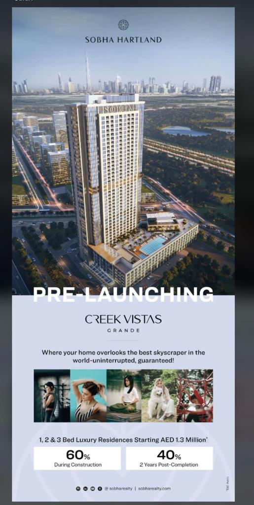 Sobha Creek Vistas overlooks the Dubai Creek, the Wildlife Sanctuary, the Dubai Canal and the Downtown Dubai, giving residents four spectacular views.